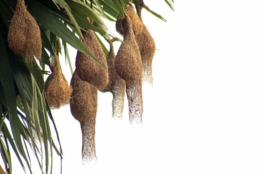 Weaverbirds intricately knot grass and twigs to build nests suspended from branches. Some designs have separate chambers for eggs and waste.